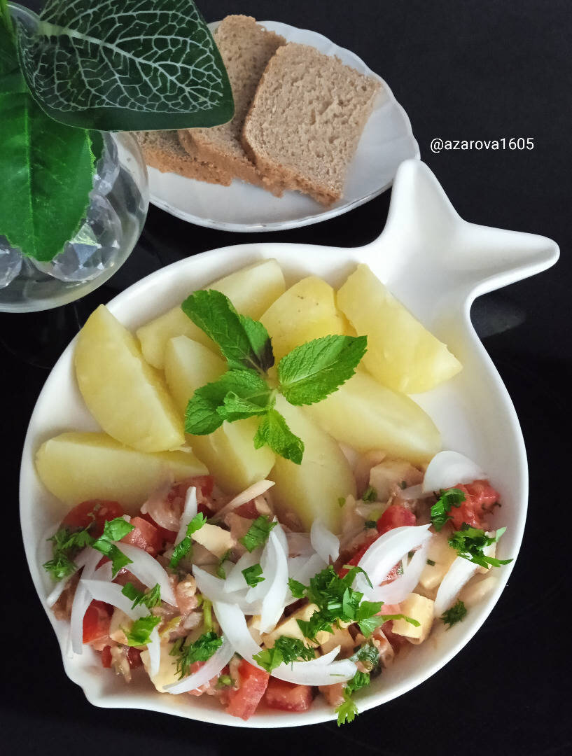 #готовимвместе Самое время летом есть молодую картошечку - просто отварную со сливочным маслицем. Можно добавить салат и получится полноценный обед. Ингредиенты: среднего помидора, вареного яйца, репчатого лука, сыра адыгейского, филе подкопченной рыбы (форель, палтус), чеснока, зелень (кинза, укроп, петрушка), майонеза, соль, молодого картофеля, укропа, сливочного масла Способ приготовления: В кастрюлю налить воду, поставить на огонь, когда закипит, добавить четвертинки очищенного картофеля, посолить, добавить веточку укропа и варить 12-15 минут на слабом огне. Пока варится картофель, приготовить салат. Нарезать кубиками помидор и сыр, полукольцами лук. Сложить в салатник. Нарезать яйцо, измельчить чеснок и зелень. Рыбку порубить мелко. Это все также добавить в салатник. Посолить, добавить майонез и перемешать. Майонез добавлять непосредственно перед подачей. С картофеля слить воду, добавить сливочное масло, затем выложить на блюдо, рядом салат, украсить зеленью и можно подавать. Вкус