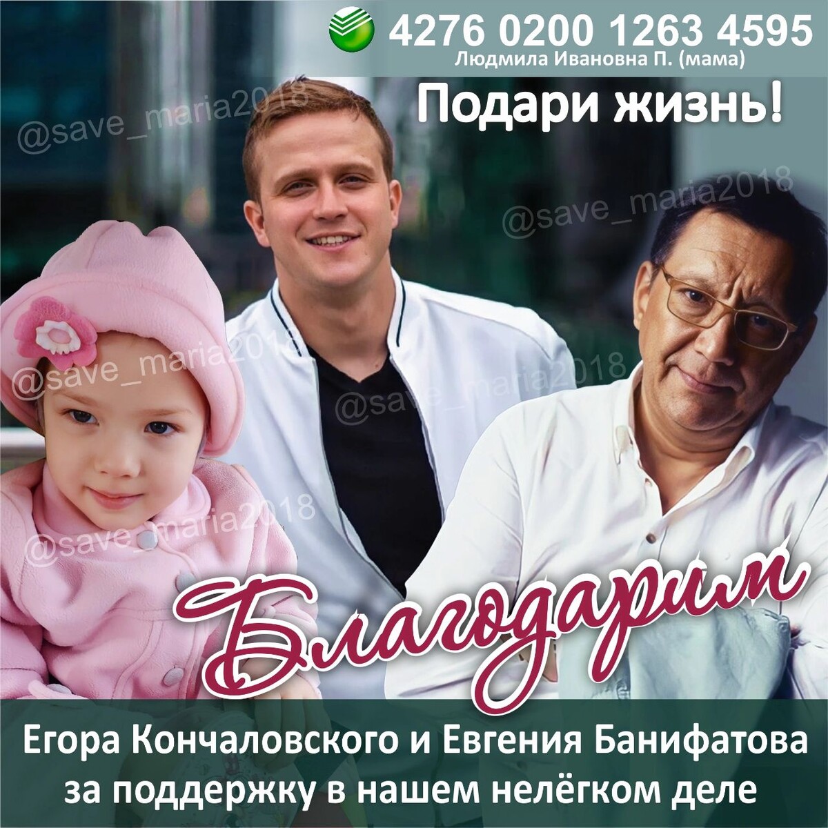 @save_maria2018 в Instagram. Дорогие наши помощники ❤️ ⠀ Желаем вам отличных выходных! ⠀ Сегодня мы хотим поблагодарить Егора Кончаловского и Евгения Банифатова за поддержку в нашем нелёгком деле - спасении любимой доченьки. Мы бесконечно признательны всем, кто принимает участие в судьбе Маруси. ⠀ Только благодаря вам, наш сбор продвигается. Маленькими шажками мы идём к Золгенсма. Но самое главное - это то, что мы не сдаемся и не теряем надежду в то, что наша малышка будет жить. ⠀ Ежедневно наша команда пополняется людьми с добрыми сердцами ❤️ С вами нам не страшно. ⠀ Большое спасибо и низкий поклон от нашей семьи и всей команды волонтёров. Нам очень нужна ваша поддержка 🙏 Помогать легко 👇 ⠀ ❤️ Поставь лайк 📝 Сделай сторис 🚀 Отправь репост своим друзьям и знакомым 💵 Переведи посильную сумму ⠀ 👧🏼Маша Яценко 4 года 🧬Диагноз: СМА - ll тип 💊Открыт сбор на Zolgensma 💰Сумма сбора = 121 000 000 руб 🆘Собрано - 70 220 987 руб ⠀ 🔴 Реквизиты родителей👇 ⠀ 💳Сбербанк: 4276 0200 1
