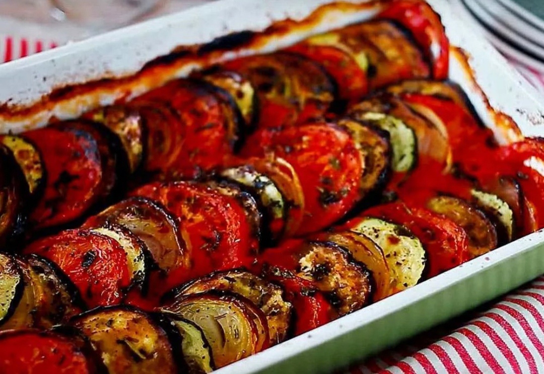 Ингредиенты: Баклажаны 2 шт Кабачки 2 шт Помидоры небольшие 4 шт Болгарский перец 2 шт Чеснок 1 головка Соль, специи, зелень по вкусу Оливковое масло Приготовление: Измельчите в блендере два помидора, перцы, чеснок, 1 ст. л масла. Остальные овощи нарежьте и выложите в форму для запекания. Смажьте соусом. Отправьте запекаться в духовку на 30 минут при 200 °С. ПРИЯТНОГО АППЕТИТА;)