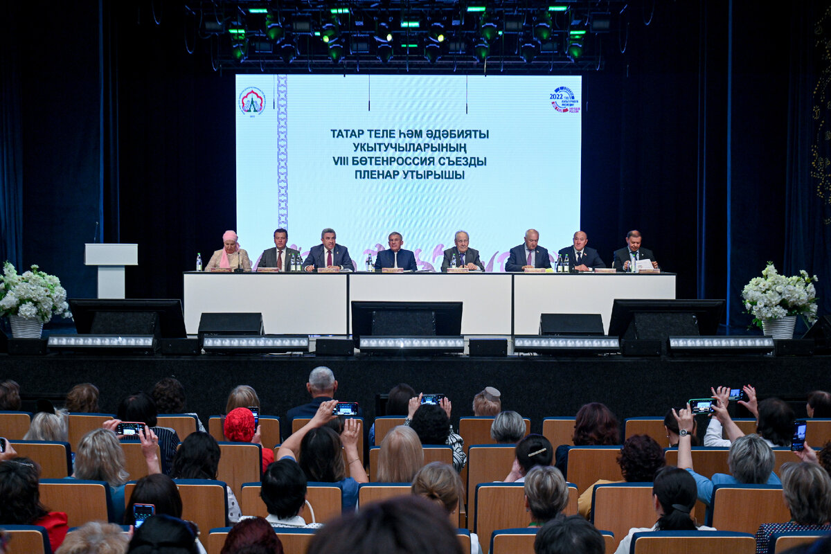 В пленарном заседании VIII Всероссийского съезда учителей татарского языка и литературы принял участие Президент Татарстана Рустам Минниханов. Встреча прошла в КЦ «Сайдаш». В мероприятии также участвовали Государственный Советник Татарстана Минтимер Шаймиев, министр образования и науки РТ Ильсур Хадиуллин, вице-спикер Госсовета республики, председатель Комиссии по вопросам сохранения и развития татарского языка Марат Ахметов, мэр Казани Ильсур Метшин. До начала заседания Рустам Минниханов и Минтимер Шаймиев осмотрели выставку издательской продукции и образовательных проектов. В своем выступлении Рустам Минниханов отметил, что сегодня уделяется большое внимание сохранению и развитию татарского языка, национальных традиций и культуры, в том числе и за пределами Татарстана. Значительный вклад в это дело вносят учителя татарского, подчеркнул Президент РТ, которые прививают детям любовь к родному языку. Рустам Минниханов обратил внимание, что в республике созданы все условия для изучения р