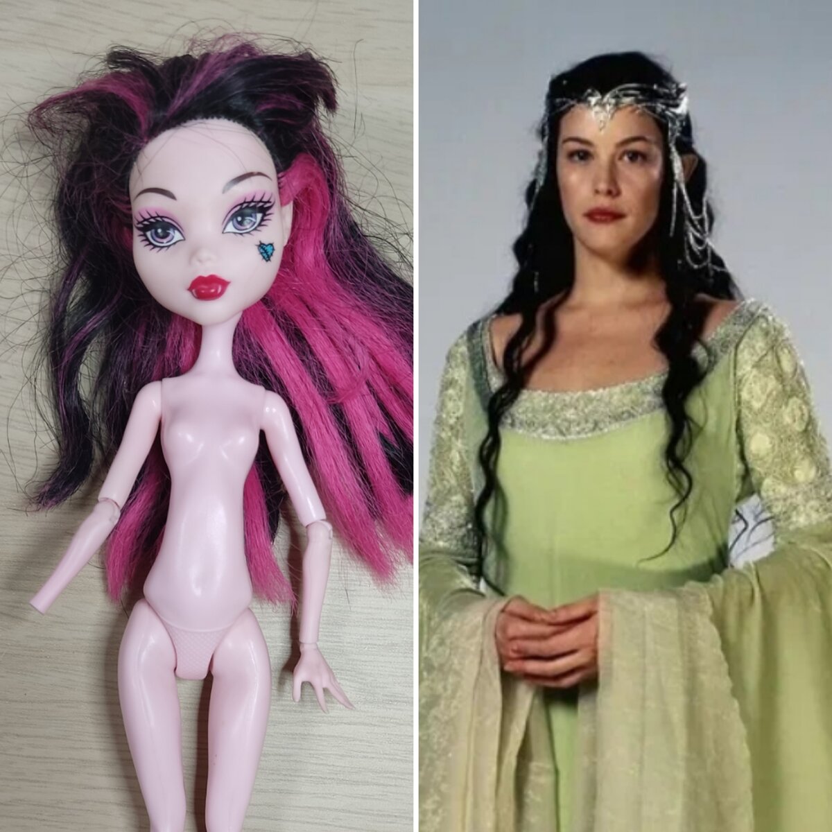Всем привет! Меня зовут Александра, и я увлекаюсь преображением (ООАКом) кукол Monster High и Ever After High. Сегодня героем моей переделки станет Дракулаура. Как вы поняли уже из названия, ей предстоит перевоплотиться в эльфийскую деву Ривенделла, Арвен. Кто давно знаком с моим каналом, возможно, помнит, что я уже делала Арвен. И тоже на базе Дракулауры. Ну а кто канал начал читать позже, можете причитать вот в эту статью. Я всегда знала, что обязательно буду делать Арвен снова. Даже купила голубой бархат для платья. Но с цветом наряда снова мимо - заказчица Алиса попросила сделать эльфийку в зелёном наряде, который не менее прекрасен. У Арвен, в принципе, все наряды прекрасны. Итак, начинаю переделку. Хотя, по сути, я её начала немного раньше, чем получила заказ. Было у меня несколько голов Дракулауры для опытов. Первую голову на фото выше я перекрасила панпастелью, чтобы, понять, возможно ли замаскировать такие пятна на лице куклы. В реальности они были значительно ярче, че