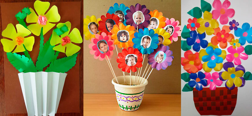 - Наклеиваем фотографии ребятишек на готовые цветки – по одной фотографии на каждый цветок.