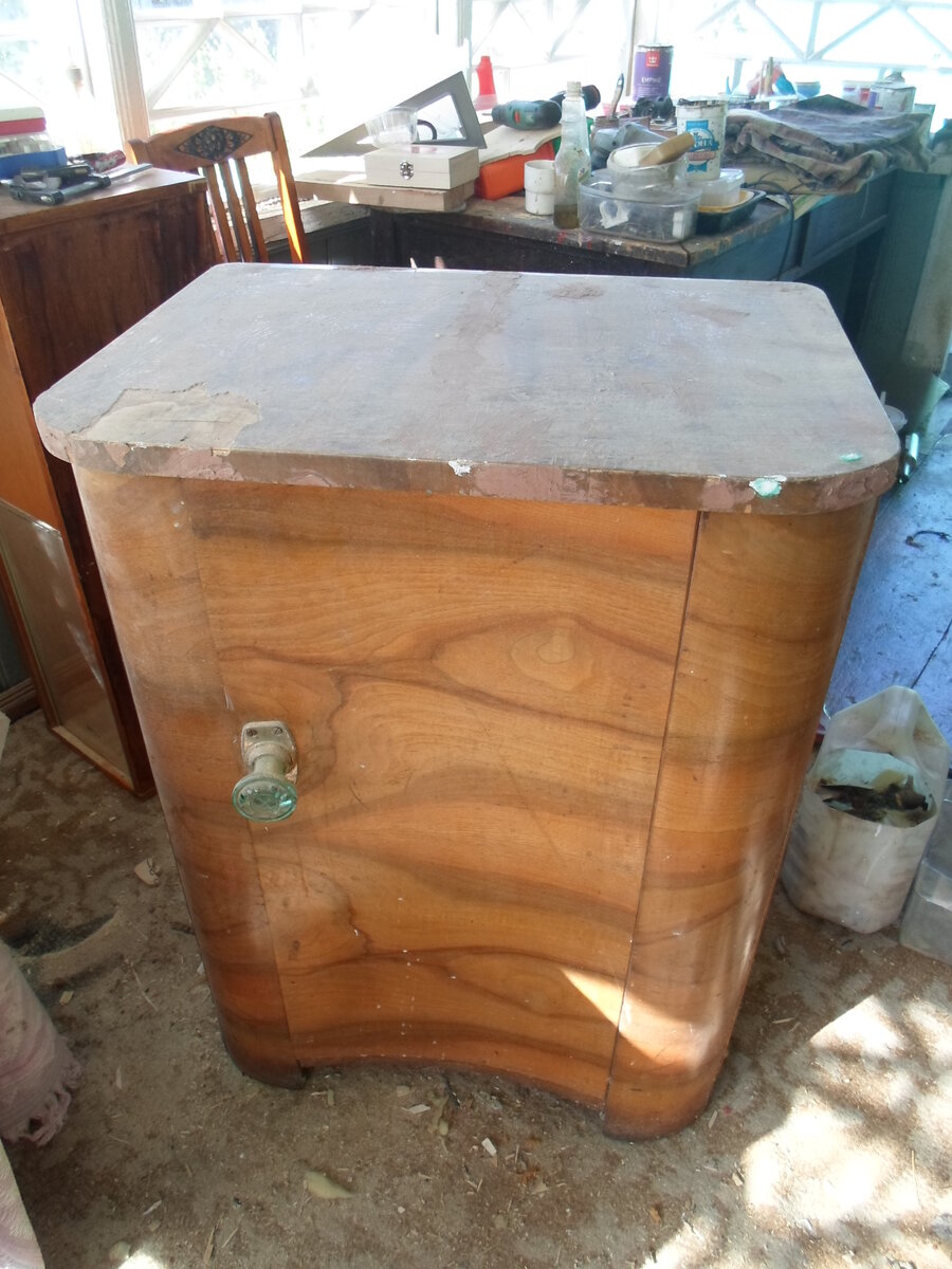 Эта тумба,мне досталась совершенно случайно и я,первое время,недооценивал эту вещь.Но потом,как говорится,дошли руки и до нее. Как я писал в предыдущих статьях,в реставрационном деле,нужно действовать последовательно и вдумчиво.После "изучения материала",выяснилось,что данная вещь была изготовлена,на рубеже 50-60 годов,20 века из березы и древесины хвойных пород,шпонирована орехом.сохранность,примерно,50%,утеряна оригинальная ручка дверцы.Требуется небольшой косметический ремонт,подбор ручки,шпонирование столешницы. Прежде,чем шпонировать столешницу,необходимо провести подготовку поверхности:шпатлевание,зачистка(зашкуривание).Это самый грязный,в прямом смысле,этап работы,т.к. образуется много пыли.Важно этот момент учитывать,а то,потом,уборка предстоит серьезная! Подобрать шпон не так просто и не всегда возможно,поэтому будем работать с тем,что есть.А есть пластины орехового шпона.толщиной 1мм,сухие(не пересушенные!!!),с ярко выраженной структурой.Подготовленную поверхность.как видно н