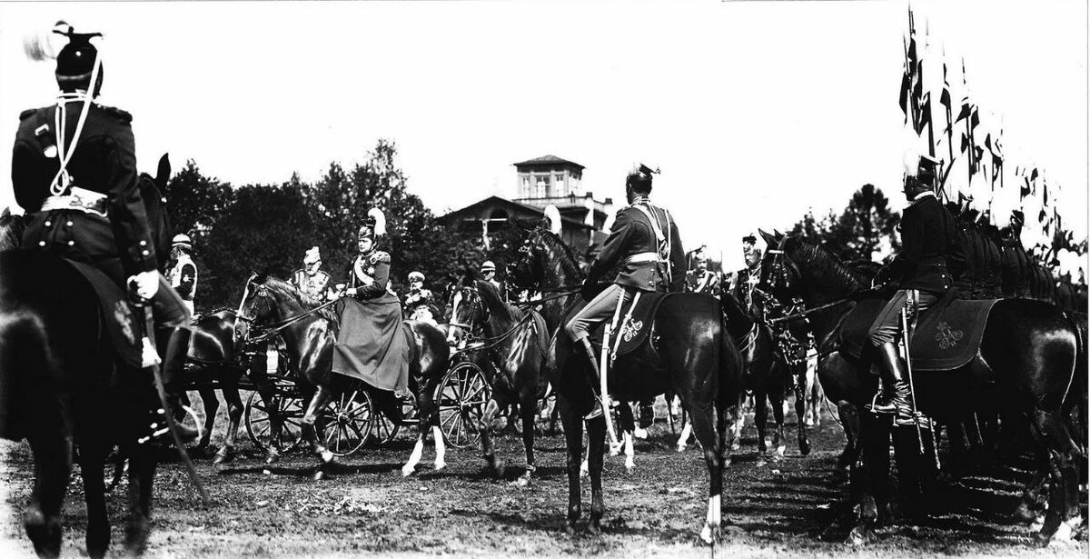 Шеф лейб-гвардии Уланского полка императрица Александра Фёдоровна объезжает строй в день празднования 250-летия полка 11 сентября 1903.