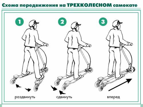 - Прежде всего необходимо научиться передвигаться на самокате. Для этого следует встать рядом с транспортным средством так, чтобы взгляд был направлен в ту же сторону, что и руль дорожного устройства. Опорную ногу, которая располагалась ближе к самокату, чем толчковая, поставить на середину деки. Руки в локтях необходимо согнуть и взяться за руль. Тело при этом находится в прямом положении или с небольшим наклоном вперед. Перенося вес на опорную ногу, необходимо оттолкнуться толчковой ногой от земли и поставить ее на платформу. Самокат будет набирать скорость при дальнейшем отталкивании ногой от земли.