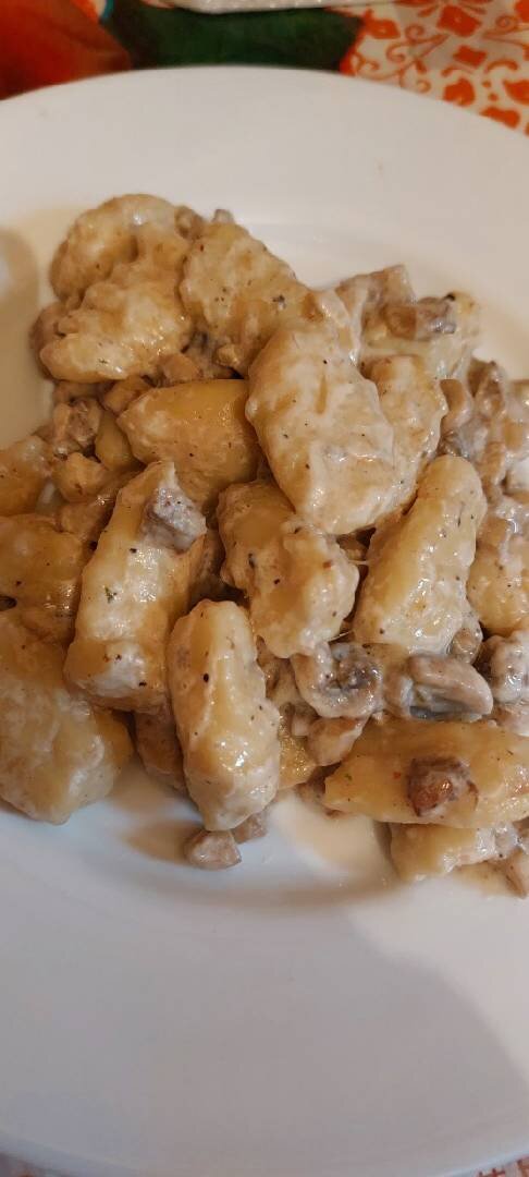 Ингредиенты: картошки, муки, яйцо, Соль , сливок 20 %, Любые грибы (у меня шампиньоны), Масло подсолнечное для обжарки грибов, луковица, Смесь 5 перцев, Грибная приправа Способ приготовления: Сварить картошку,пусть остынет,размять толкушкой Добавить муку,яйцо,соль, тщательно перемешать Готовое тесто немного обвалять мукой,распределить визуально на 4 части,из этих частей скатать тонкие колбаски,нарезать на небольшие кусочки, и зубчиками вилки пройтись по тесту,как бы делая спираль Грибы обжарить с луком на подсолнечном масле,добавить смесь 5 перцев,грибную приправу по вкусу,как обжарились грибы добавить сливки,и потушить до загустения Сварить ньокки,с момента всплывания на поверхность кастрюли, варить около 2 мин,добавить ньокки в грибной соус и потушить пару минут Вкусный ужин для вас и вашей семьи готов♡♡ Всем приятного аппетита ♡♡♡