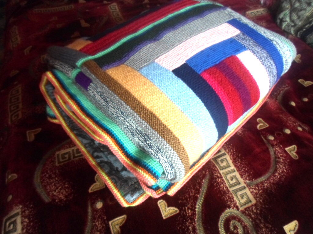 Всем доброго времени суток! Этот плед оказался долгостроем. Верхнюю часть связала достаточно быстро и сшила все детали между собой, а также обвязала по контуру. А вот нижнюю часть только недавно сделала, вязание лежало аж с прошлой зимы, доделать - то нужно было всего- ничего, подшить тканью, чтобы спрятать все многочисленные кончики ниток. Доделывала плед совсем не долго, примерно минут 30 - 40. А вот настраивалась месяцами. Ведь в промежутках еще несколько проектов было сделано. Наконец - пришел черед доделки самого пледа. Ура! Готово! Плед получился достаточно теплый, похожий больше на одеяло. он состоит из трех слоев: - вязаное полотно из больших квадратных мотивов (всего 12 таких мотивов 3 х 4) - тонкий синтепон для прослойки - ткань бязь. Раннее я уже писала статью, о том как вязала такие мотивы и всю верхнюю часть, можно посмотреть тут. Для вязания использовала разнообразные остатки пряжи, решила их так