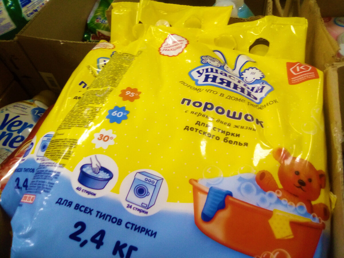 Да нет, зависла тут на целый час, если не дольше. Новинок уйма, и всё ещё вывозят коробки в торговый зал. Некоторые товары, даже не выкладывают на полки, а так и оставляют в коробках между стеллажами. Итак, хотите узнать, на что я обратила своё внимание на этот раз? Смотрите... Не забывайте листать фото, чтобы увидеть больше. Привезли стиральный порошок "Ушастый нянь", который создан специально для детской одежды. Не вызывает аллергических реакций.