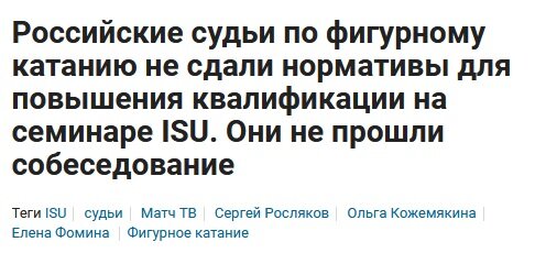 Представителям России, имеющим огромный опыт судейства на крупнейших российских и международных соревнованиях, повысить квалификацию не дали, в то время как ряду судей из европейских стран, США, Канады, Австралии, где не могут похвастаться фигурным катанием такого уровня, как в России, это удалось».