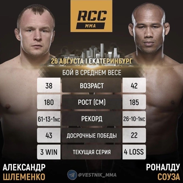 Бразильский боец Роналдо «Жакаре» Соуза является главным кандидатом на бой с Александром Шлеменко, который остался без соперника после того, как Магомед Исмаилов выбыл из состава участников турнира RCC 12. Об этом в интервью Матч ТВ сообщил исполнительный директор лиги RCC Николай Клименко. Если бой Шлеменко и Соузы состоится, он станет реваншем – в апреле 2006 года на турнире Jungle Fight 6 в Бразилии Жакаре уже в первом раунде финишировал россиянина удушением ручным треугольником. Весной прошлого года 42-летний Роналдо Соуза потерпел четвертое поражение подряд, уступив рычагом локтя Андре Мунизу, после чего был уволен из UFC, где выступал восемь лет с момента поглощения Strikeforce. 38-летний Александр Шлеменко идет на серии из трех побед, в последнем поединке выиграв единогласным судейским решением у Артура Гусейнова. Напомним, что турнира RCC 12 состоится 26 августа в Екатеринбурге.