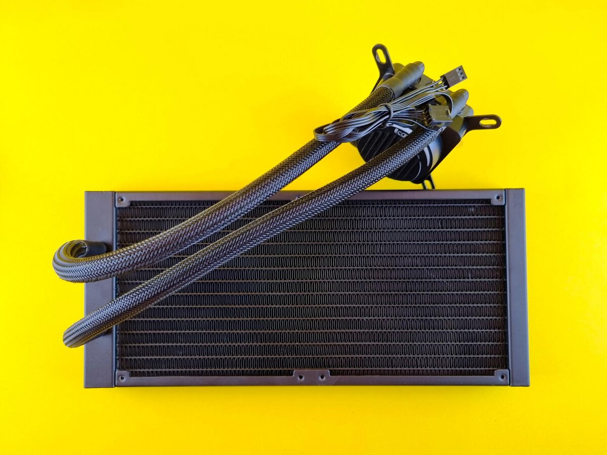 Комплектные вентиляторы 140 мм с 9 лопастями, идущими друг за другом с минимальным расстоянием, в наличии резиновые антивибрационные прокладки с обоих сторон. Шланги в жёсткой совершенно стандартной оплётке, разве чуть более тонкие, чем у трёхсекционных решений, что ранее попадали к нам в редакцию. Гнущиеся фитинги, медное основание водоблока неплохо отполированное, но не стремящееся поставить какие-то рекорды. Словом, всё на хорошем уровне.