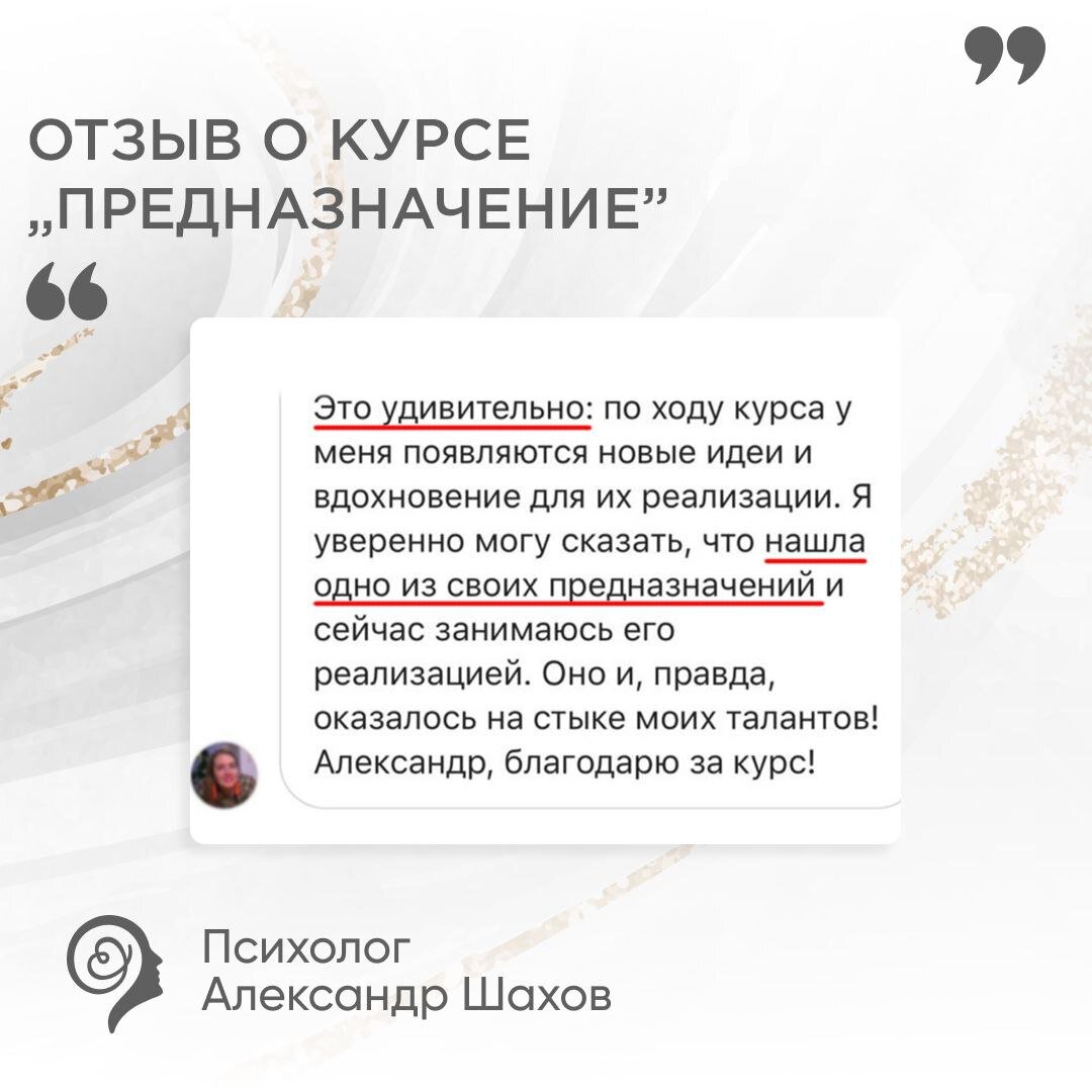 Мой курс "Предназначение" подойдет для тех, кто находится в поиске профессии, которая будет приносить доход. В этой программе вы пройдете специальные тесты, определите какие у вас таланты, чем хотите на самом деле заниматься, разберетесь со своими страхами, построите план и начнете зарабатывать на деле, которое будет приносить удовольствие. Подробнее здесь.