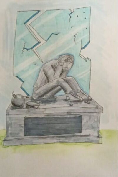 Я и мои друзья живем в мирной стране. Над нами чистое небо и яркое солнце. А совсем недалеко, на Луганщине, живут дети, которые слышат свист пуль и разрывы снарядов. И взрослые, и дети сутками находятся в подвалах, потому что рушатся дома и школы. Но самое страшное происходит тогда, когда родители теряют детей, а дети – родителей. Война – это страх, боль и потери, это преступление. И я хочу, чтобы люди помнили об этом. Ведь мир такой хрупкий! В память о погибших детях я создала свой памятник. Он сделан из серого камня и состоит из прямоугольного постамента и фигуры мальчика-подростка, который прикрывает голову руками, защищаясь от пуль. Рядом с ним лежат не книги и тетради, а боевые снаряды. Лицо мальчика очень грустное, взволнованное. Губа прикушена, как будто он чего-то боится. Фигура мальчика располагается на фоне разбитого стекла, и самая большая трещина указывает на него. Это единственное, что ограждает ребенка от войны. А за стеклом голубое небо – символ счастья, радости, мира. Н