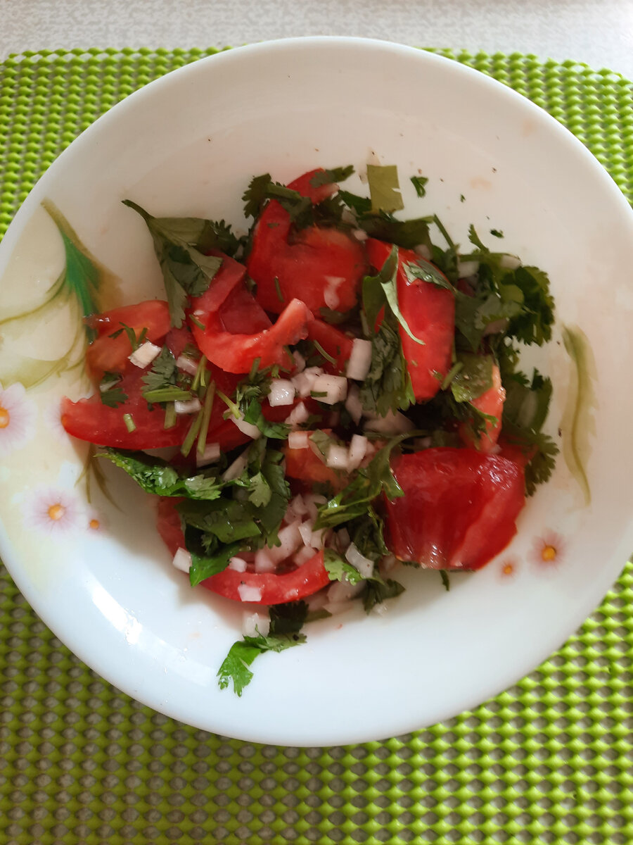 Сегодня хочу обратить ваше внимание на простой, но очень вкусный салатик. Помидоры с кинзой, которая и определяет своеобразный вкус салата. Я отношусь к любителям кинзы, часто добавляю ее в разные блюда. Она пркрасно дополняет вкус мясных блюд, хорошо сочетается с крупяными и овощными. Кто еще не вполне оценил эту замечательную травку - присмотритесь, она еще и очень полезна. Обладает уникальными свойствами снимать отеки, снижает холестерин и сахар. Очень полезна она и для мужчин. Ну вы понимаете, о чем я. А теперь сделаем салат. Берем 1 крупный спелый мясистый помидор, режем его чуть мельче, чем в обычный салат. Половинку репчатаго лука изрезать очень мелкимм кубиками. Выжать на него дольку лимона, посыпать черного молотого перца. Щедрый пучок зелени кинзы промыть под проточной водой, обтряхнуть, порезать. Все соединить в салатнике. Заправляю оливковым маслом. Можно сделать брускетту: на подсушенный в тостере или поджаренный кусок хлеба выложить пару ложек салата, тоже вкусненько. П