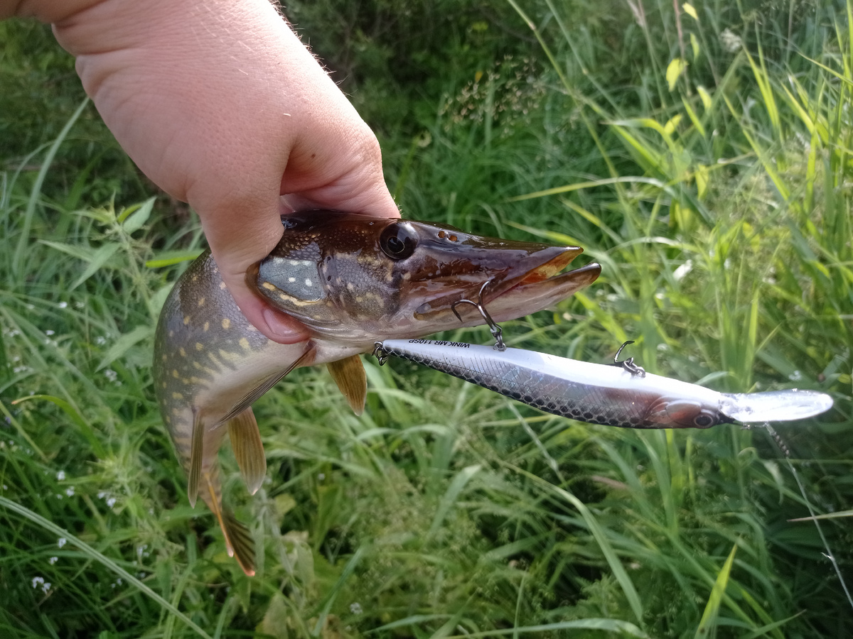Немного,всего лишь пару часиков прогулялся по реке. Высокая трава явно мешает моему перемещению по берегу реки, но ничего, главное что жара ушла и стало комфортнее находится на реке.Мест, где можно покидать стало очень мало.Река заросшая, что на берегу, что в воде. Но точка "под мостом" была почти чиста от водорослей ,и при этом работает всегда. Сначала получил поклёвку на Ватсон 110. Небольшой шнурок и очень злой, так ударил по воблеру,( когда он уже находился на поверхности), что тот(воблер) улетел на куст, где повис на ветки. Пройдя немного, вяжу винк 110 МР и пару шнурков удается выдернуть из воды. Еще поклевка на флирт 115, где рыба завела в кувшинки и была такова. В общем, рыбалкой доволен. Как говорится, хоть рыбу подержал в руках. Пока на этом всё.