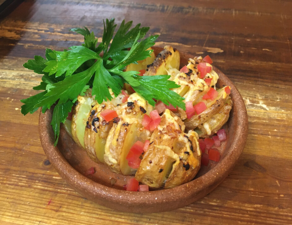 Когда картошка готова, разворачиваю её и перекладываю на противень смазанный маслом. Сверху поливаю чесночным маслом. Так, чтобыоно попало в каждый надрез. Посыпаю солью и немного сахаром. Ставлю в прогретую духовку на максимальную температуру на 5 минут. Пока печётся картофель, подготавливаю лук. Его я мелко режу и обжариваю на сковороде. Вы можете подобрать дополнительные ингредиенты на свой вкус. Ну вот, картофель готов и запечён. Можн