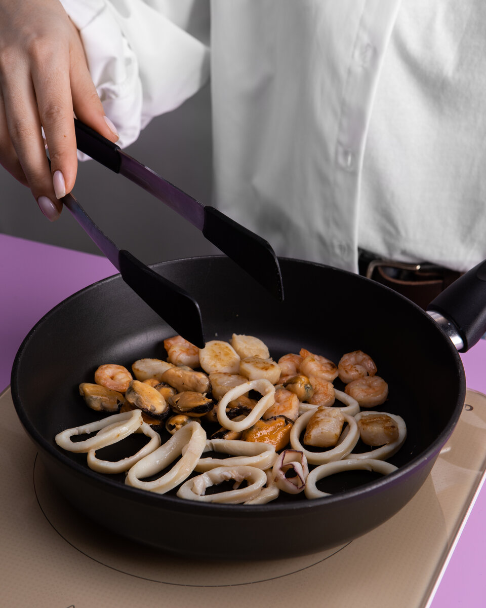 1. Морской коктейль обжариваем 4-5 минут на растительном масле с добавлением соли и перца.
