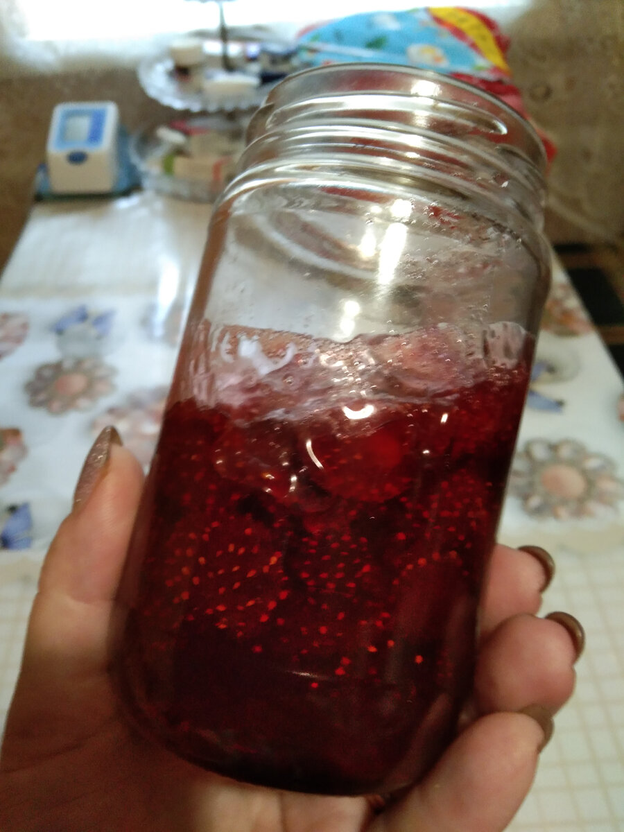 Полную баночку добавила к батарее банок с огурцами, а неполную пока убрала в холодильник: завтра день сбора ягод и я буду варить варенье, вот тогда эту баночку и дополню.