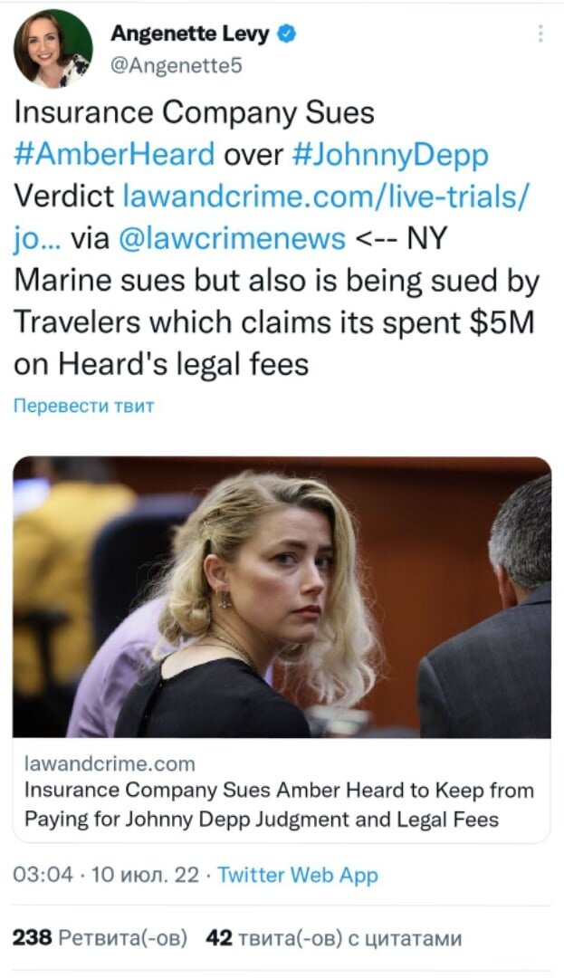 The New York Marine and General Insurance Company подала иск против Херд в пятницу (08 июля 2022г) в Окружной суд США по Центральному округу Калифорнии. Эмбер Херд была застрахована The New York Marine and General Insurance Company с 18 июля 2018 года по 18 июля 2019 года - решающий период времени для дела о диффамации. Эти временные рамки включают дату, когда Херд написала и ретвитнула печально известную статью в Washington Post - статью, в которой она утверждала, что является “общественным деятелем, представляющим насилие в семье”. Обсуждаемый заголовок гласил: ”выступаем против сексуального насилия“ и "сталкиваемся с гневом нашей культуры”.