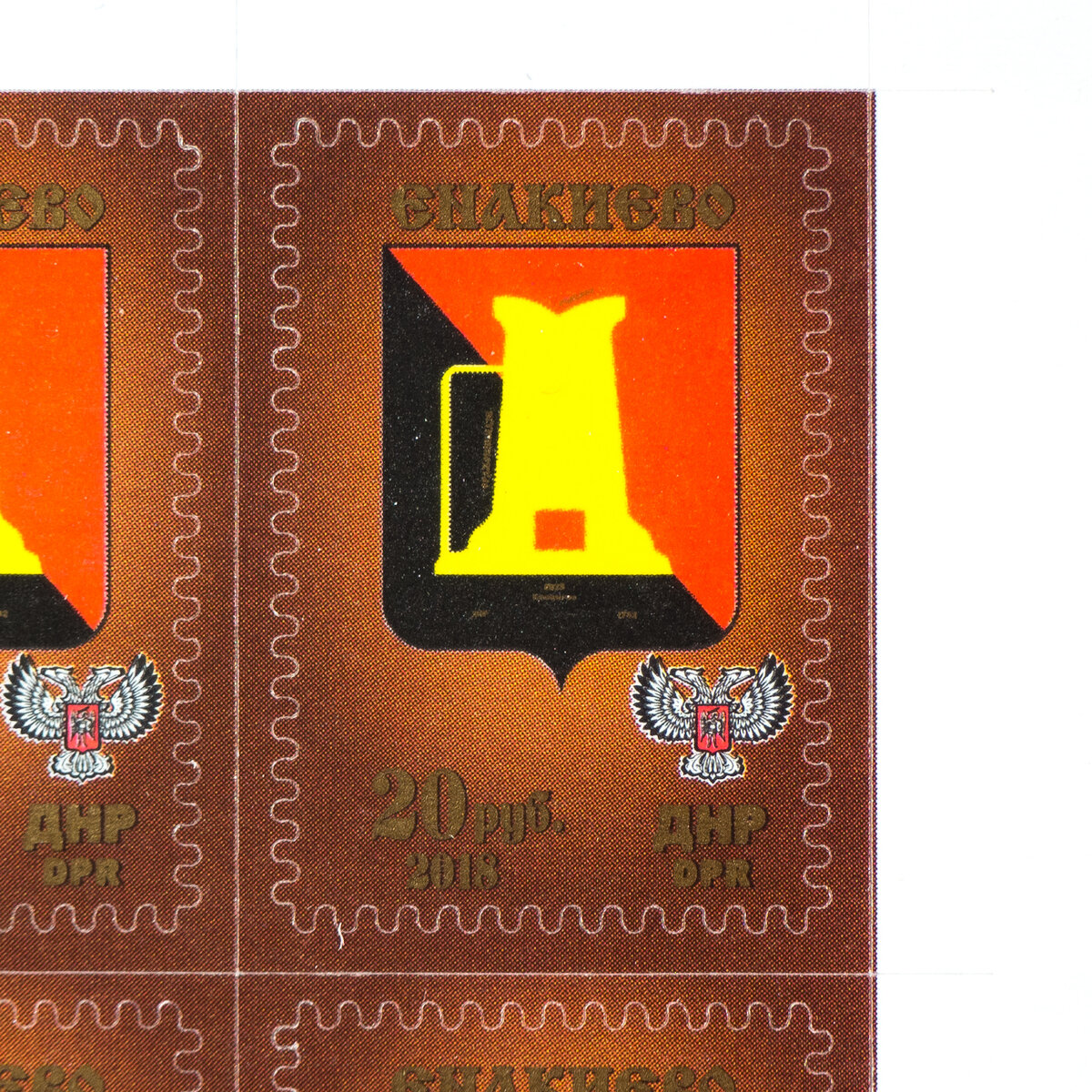 Первые поселения на месте Енакиево были основаны в 1783 году. Во второй половине XIX века местность вокруг будущего города активно развивалась: строились заводы, открывались шахты. Было организовано Русско-бельгийское металлургическое общество Енакиево, названное по имени своего основателя. Также была названа и местная железно-дорожная станция. После революции 1917 года Енакиево получает статус города и продолжает активно развиваться. Город сначала был переименован в Рыково, а затем в Орджникидзе. В 41-43 годах находился в оккупации. В апреле 2014 году находится под контролем ДНР. Первый выпуск стандартных марок ДНР состоялся в 2015 году и состоял из гербов городов: Шахтерск, Докучаевск, Горловка, Иловайск, Енакиево, Дебальцево, Донецк. Блок из четырех марок с полями. Донецкая Народная Республика «Енакиево» 2018 (стандарт) Цена: 219₽