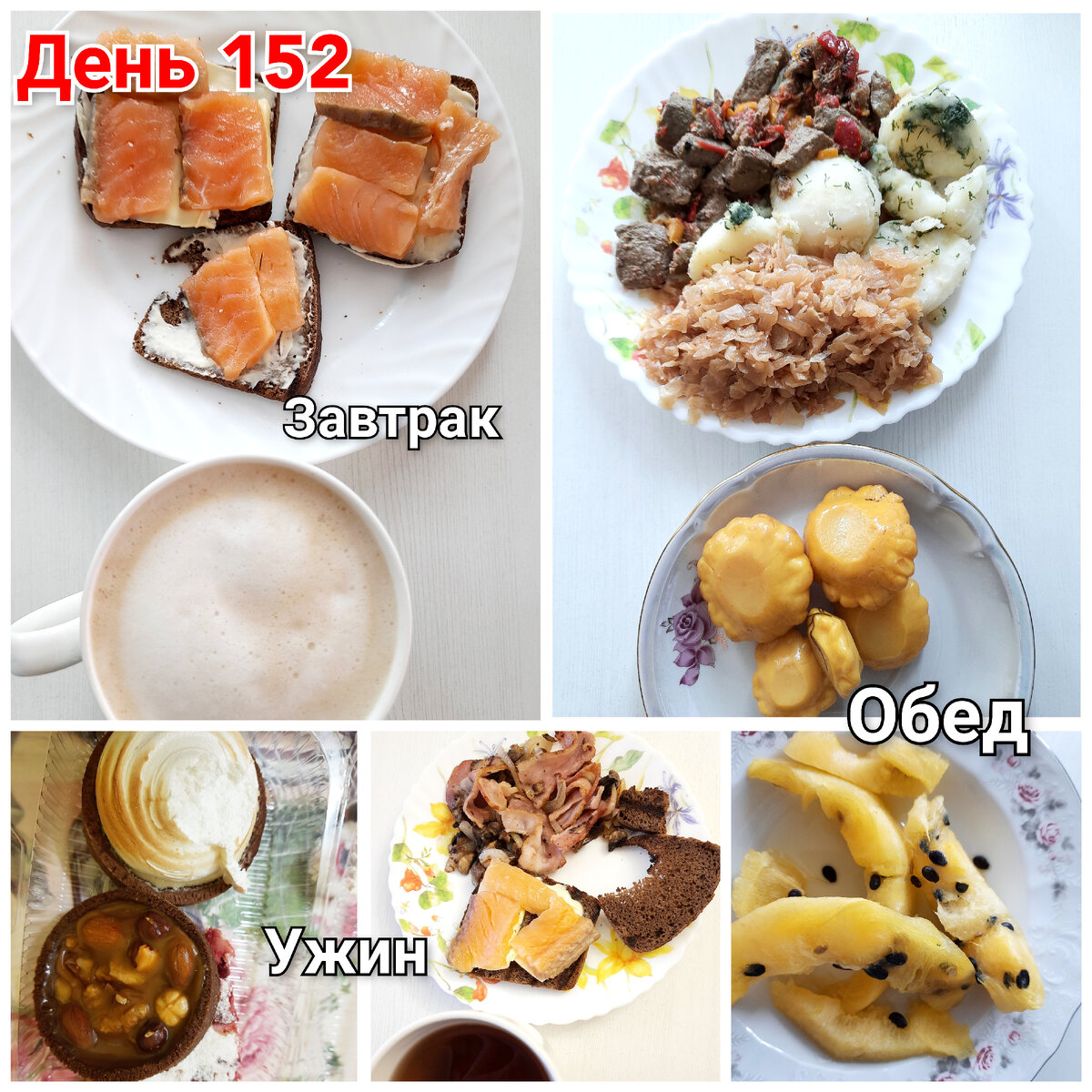 #Завтрак – кофе со сливками и сахаром 15г. Ржаной диетический хлеб на гриле, плавленый сыр, сливочное масло, слабосоленая семга. #Обед – полностью как в дне 151 - молодой отварной #картофель, говяжья #печень со сладким перцем (рецепт в дне 141). Консервированные патиссоны из магазина. Тушеная #капуста. #Десерт – желтый арбуз. #Ужин – а вот тут небольшой зажор у меня случился((( Бутерброд со сливочным маслом и слабосоленой семгой. Бекон, обжаренный с луком и шампиньонами. Чай с пироженками из магазина – 3 штуки на двоих человек, к сожалению меренга у одной из них помялась, эх((( 🔥 Подписывайтесь – это лучшая благодарность за мой труд!