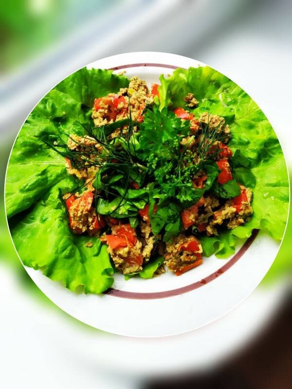 Вдохновила себя сегодня на скорую руку,делюсь с вами мои кукпадцы #завтрак #летнееменю #наскоруюруку #вкуснобыстро Ингредиенты: Sneksi sticks wild mustard "Колбаски", Изделие колбасное паштет мясной вареный особый "Мясны куток", Листья салата, Листья шпината, Зелень петрушки и укропа, Болгарский перец замороженный, Яйца куриные , Соль, Черный молотый перец и острый красный, Растительное масло, Зелень лука Способ приготовления: Моем зелень В миске взбиваем два яйца, солим, перчим. В глубокую сковороду выливаем немного растительного масла, кладём замороженные кубики красного болгарского перца, нарезанный мелко чеснок, острый красный перец, зелень лука, и нарезанные мелко колбаски, томим немного без крышки, перемешивая. Добавляем затем взбитые яйца и снова всё перемешиваем. Берём тарелку выкладываем листья салата, сюда же приготовленное наше блюдо, добавляем нарезанный шпинат и салат, украшаем зеленью укропа и петрушки. Всем приятного аппетита и доброго утра.