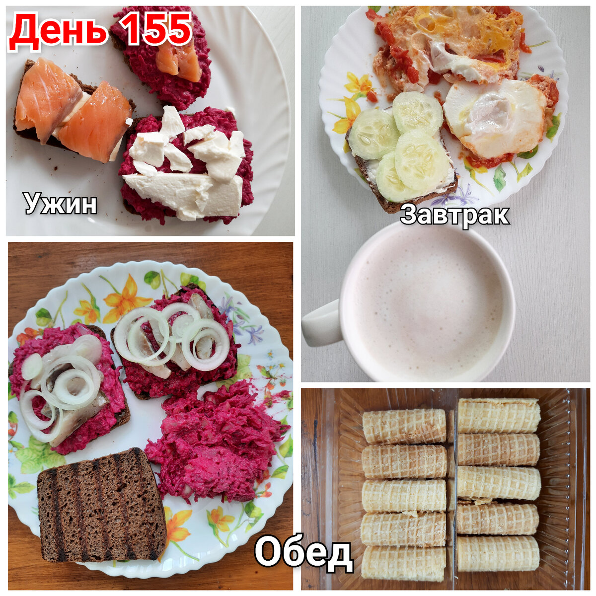 #Завтрак – кофе со сливками и сахаром 15г. #Яичница с помидорами и луком. В сковородку добавляю #помидоры, лук, обжариваю пару минут, помешивая. Добавляю 2 яйца, солю все вместе и готовлю пару минут, чтобы схватился белок. Хлеб на гриле, творожный сыр и огурец сверху – такое простое сочетание, а мне так понравилось! Очень вкусно. #Обед – я очень люблю салат #Селедка под шубой (классический вариант салата, как делаю его я в дне 48), но его долго делать – слои выкладывать, ждать, пока пропитается. И я подумала, а что если не слои выкладывать, а все перемешать вместе, как оливье? И решила протестировать. А еще нашла рецепт Селедки над шубкой – это такие бутерброды, где все ингредиенты (кроме селедки) смешаны и выложены на хлеб в качестве намазки, а сверху уже селедка большим куском, и еще можно лук для украшения, но и в намазке лук тоже есть. Итак, 1 большая луковица (мелко режу), 3 вареных яйца, 4-5 средних картофелин, 2 средние свеклы (варю всегда с запасом, если остается, то я ее замор