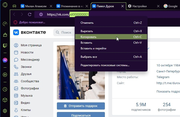 2. Вводим в строку поиска id закрытого профиля(обычно цифры id светятся в строке браузера, когда заходитесь на странице нужного профиля) ,например id000000001