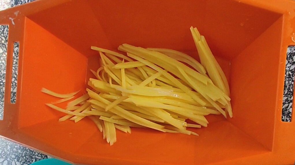 Здравствуйте, дорогие читатели. Сегодня я хочу с вами поделиться очень необычным и вкусным рецептом. Я слышала его очень давно, лет 20 назад (а может и больше) в одной из кулинарных передач. Даже записывала в свой блокнот, но так и не решилась повторить. Потом блокнот потерялся, вместе с ним потерялся и рецепт. А где-то в дальних уголках памяти он остался. Не чётко, без подробностей. Просто я помнила, что он был и был очень необычен. Я не знала названия, поэтому не могла найти его в интернете. Единственное что я помнила, это то, что в нём используется почти сырой картофель и что это типа корейское блюдо. Я собрала и восстановила его по крупицам, и название придумала этому блюду сама. Получилось неожиданно вкусно и космически быстро. Встречайте и оценивайте, буду очень рада вашим комментариям. Давайте начнём. ✅ Картофель нужно нарезать тонкой стружкой. Для этого лучше воспользоваться шинковкой или тёркой для корейской моркови. Но можно и ножом порезать. Если взять продолговатую карто