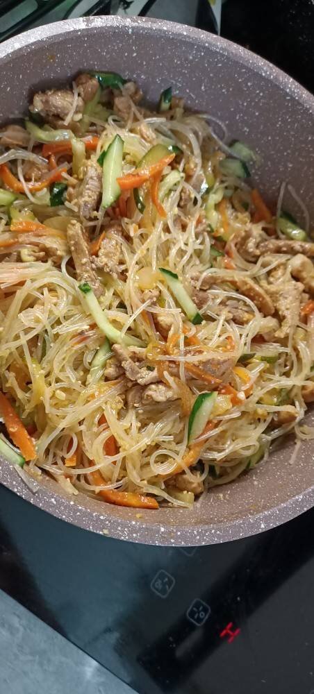 Ингредиенты: Свинина, Лук, Морковь, Кабачок, Огурец, Соевый соус, Масло растительное, Приправа Чим Чим для хе, Фунчоза Способ приготовления: Мелко нарезать мясо, обжарить, добавить лук, морковь и приправы(я ещё чеснок добавила), накрыть крышкой на пару минут, после хорошенько перемешать и обжарить. Накрыть крышкой на 3 мин, снова перемешать, добавить кабачок и оставит под закрытой крышкой на 5 мин, убрать крышку и обжаривать пока не выпарится вся жидкость в сковороде. Фунчозу запарить на 4-5 мин, высыпать в салатницу, добавить огурец, наши обжаренные овощи с мясом, все перемешать и дать настояться 15-30 мин.