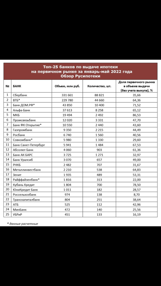 Высшая ипотечная лига. Топ-25 банков по итогам выдачи ипотечных кредитов за январь-май 2022 года на первичном рынке.