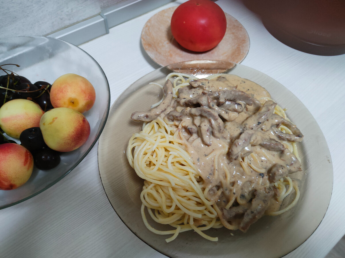Привет! Сегодня приготовим классическое русское блюдо, получившее свое название в честь графа Строганова. Бефстроганов это своеобразная тонкая нарезка мяса в соусе. У нас сегодня говядина в белом соусе. Скажу, что по такому принципу я готовлю и говяжью печень и даже куриную, вот только с куриной нарезка получается кубиками))) Нарезаем говядину тонкими и длинными полосками. У меня мясо слегка подмороженное, так проще получить нужную толщину кусочка. Мясо кладем на сухую, разогретую сковороду. Так выпаривается жидкость из мяса , если есть, потом добавляем нарезанный репчатый лук и немного подсолнечного масла без запаха. Обжариваем мясо с луком до золотистого цвета, солим, перчим, можно добавить сухую зелень и присыпаем мукой. Теперь обжариваем все вместе с мукой, постоянно помешивая, до тех пор пока вся мука не станет светло коричневого цвета и перестанет быть заметной. Мука играет роль загустителя , именно благодаря муке соус приобретает "вкусную" тягучую консистенцию. Не забывайт