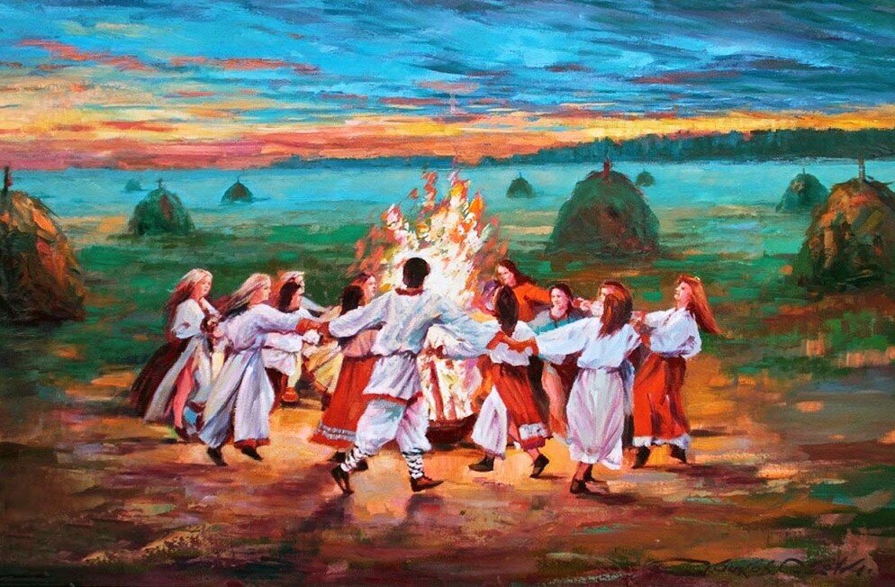 О. Это как праздник чествования достатка самой жизни, чтобы все было хорошо, природа чтобы была такая как есть. Восхваляем природу и мы ей показываем, что все, что она делает нам хорошо. Мы этим своим безудержным весельем даем духам заряд, чтобы им тоже было с нами весело, чтобы они точно также продолжали благоволить как всегда. Мы просто как сумасшедшие прыгаем вокруг обелиска, хохочем, веселимся, аж косы ходуном ходят вверх-вниз. Костры. Очень красиво.