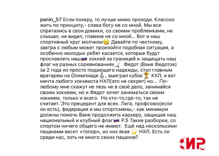 Привет, с вами Игорь Рабинер. Первый действующий хоккеист четко высказался по ситуации с Иваном Федотовым. Респект, Григорий Панин. Классно жить по принципу,- слава богу не со мной. Мы все спрятались в свои домики, со своими проблемками, не слышал, не видел, главное не со мной… Вот и наш спортивный круг молчком. Давайте по-честному, завтра с любым может произойти подобная ситуация, а особенно молодых ребят касается, которые будут прославлять наш хоккей за границей и защищать наш флаг на разных соревнованиях. Федот (Ваня Федотов) за 2 года из просто подающего надежды, стал главным вратарем на Олимпиаде, выиграл кубок КХЛ, и вот мечта любого хоккеиста — НХЛ (это не секрет) но… По-любому мне скажут не лезь не в своё дело, занимайся своим хоккеем, но и Федот хочет заниматься своим хоккеем, только и всего. Но кто-то где-то, так не считает. Это прецедент для всех. Лига, профсоюз (если он есть), федерация и мы спортсмены как минимум должны помочь Ване продолжить карьеру, защищая наш националь