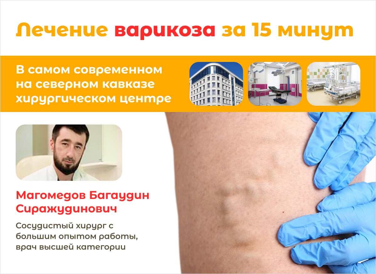 Варикоз, варикозная болезнь – заболевание, проявляющееся расширением поверхностных вен нижних конечностей. При этом стенки этих сосудов, как правило, теряют свою эластичность. Возникают, так называемые, "шишки", "узлы", "звёздочки" на ногах, сопровождающиеся развитием клапанной недостаточности. Пациенты при этом обычно жалуются на боль и тяжесть в ногах, повышенную утомляемость. Данная патология относится согласно Международной классификации к хроническим заболеваниям вен и её распространённость среди населения очень высока, в среднем доходит до 60%. Оперативное лечение варикоза в Махачкале Можно ли вылечить варикоз за 15 минут? Можно, если лечение производится в новом хирургическом центре "Целитель" в Махачкале. Здесь опытный сосудистый хирург Магомедов Багаудин Сиражудинович проводит хирургическое лечение варикозной болезни под местной анестезией с одновременным проведением склерозирования вен нижних конечностей. И всё это за считанные минуты. После процедуры пациенты обычно в течен