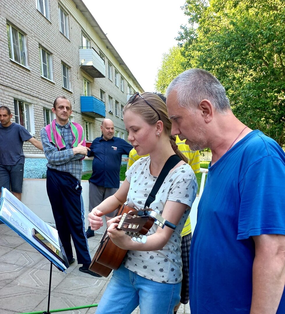 Волонтеры фонда «Старость в радость» поехали на неделю в Кимрский психоневрологический интернат Тверской области. Сюда бывают однодневные поездки, и жильцы очень ждали визита знакомых волонтеров. В Кимры приехали трое волонтеров из Москвы, трое живут в Кимрах и приходят в лагерь каждый день, один волонтер приехал из Ржева. Не обязательно присутствовать в лагере всю неделю: кто-то присоединяется не с первого дня, кто-то вынужден уехать раньше – дело все равно найдется каждому. Волонтеры всю неделю жили на территории интерната, сами себе готовят, но главное – постоянно общаются с жильцами дома. В основном здесь живут молодые инвалиды (возраст может быть любым, начиная с 18 лет, и часто «ребятами» ощущают себя и люди под 60), в отделении милосердия есть и пожилые. Главная особенность – это чисто мужской интернат. Если у человека стабильное состояние, то он живет в «открытом» корпусе, и у многих есть велосипеды, они свободно выходят в город гулять, а некоторые посещают городскую студию тан
