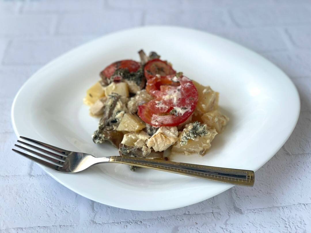 Обед нуууу очень вкусный😋 Ингредиенты: Картофель, Куриное филе, Шампиньоны, Лук, Помидор, Сметана 10%, Яйцо, Укроп, Вода, Растительное/кокосовое масло для жарки, Соль, перец Способ приготовления: Картофель очищаем, режем мелким кубиком. Кладём в форму для запекания. Лук очищаем, нарезаем кубиком, грибы моем и режем на 4 части каждый. Лук обжариваем на масле до золотистого цвета и добавляем грибы. Обжариваем на среднем огне пару минут. Выкладываем обжаренные грибы с луком в форму для запекания сверху картофеля. Куриное филе нарезаем мелкими кусочками. Обжариваем пару минут на сковороде (после грибов и лука). Выкладываем 3м слоем в форму для запекания. Помидор режем кружочками. Добавляем в запеканку. Смешиваем сметану, яйцо и воду, добавляем мелко нарезанный укроп, соль, перец. Перемешиваем. Заливаем запеканку сметанным соусом. Накрываем фольгой, делаем несколько дырочек. Выпекаем в разогретой до 180t духовке 35 минут. Если любите сырную корочку, добавьте через 30 минут натёртый сыр и д