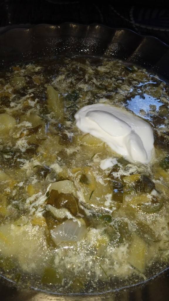 Ингредиенты: ревень (листья и стебель), картофель, мясо (свинина) можно любое, лук, морковь, зелень укропа, петрушки, лук, чеснок, хмели-сунели, лаврушка , кубик на косточке , яйцо, вода Способ приготовления: В отварное мясо добавить картофель кубик. Пассеруем лук, морковь. Добавляем резаные стебли ревеня, и пережариваем до прозрачности ревеня. Когда картофель готов добавить резаные листья ревеня и пассеровку. Варим 5 мин. Добавить (помешивая) взбитое яйцо. Варим 2 мин. Добавить зелень (мелко порезать). Довести до кипения. Приятного аппетита.
