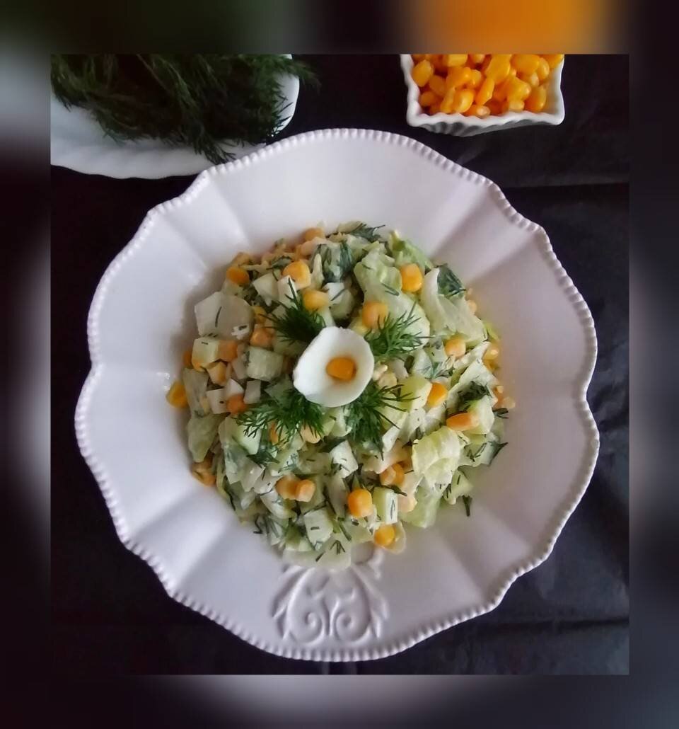 Салат из айсберга с огурцом свежим, кукурузой и яйцом