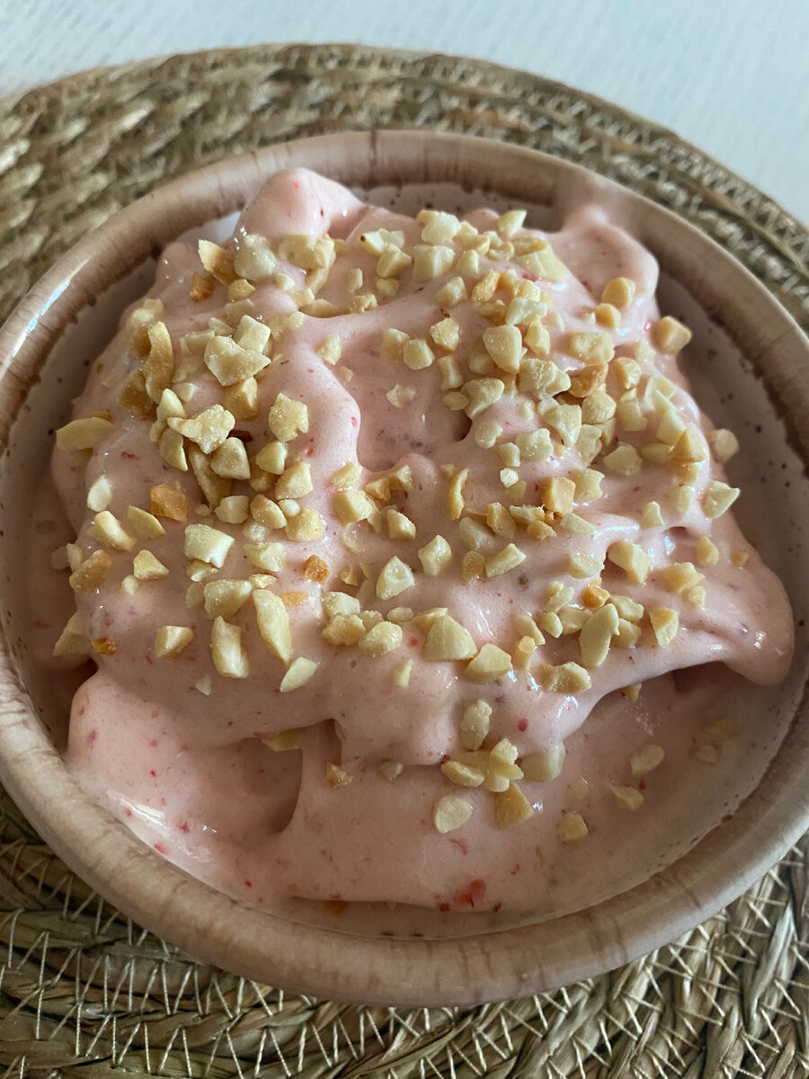 Состав: 1) 1 банан 2)30гр. клубники 3)20мл кокосового молока,можно взять обычного молока,можно воду Приготовление: 1) банан очистить и нарезать на 5-6 частей 2) клубнику помыть и вместе с бананом заморозить в морозилке 3)достать через пару часов и измельчить замороженную клубнику и банан в блендере(только не погружным)
