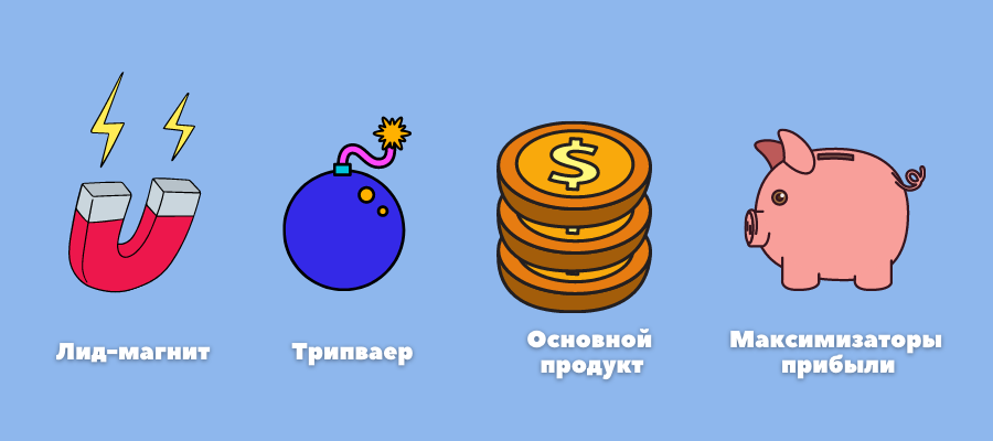 Это первый товар, который покупают за деньги (небольшие). Целевая аудитория, подогретая лид-магнитом, охотно соглашается на приобретение полезного трипваера за символическую сумму. Это второй этап воронки. Третий шаг – собственно, большая продажа, затем идут допродажи.