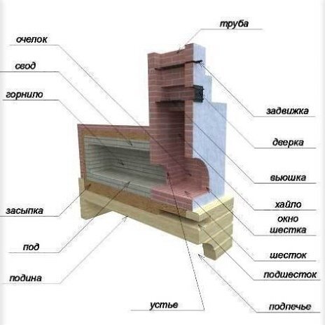 Много веков прошло с тех пор, как она была изобретена, однако её кое-где в деревнях используют и поныне. У «русской печи» есть, так называемый, под - замкнутое пространство внутри самой печи, которое хорошо прогревается, но дым внутрь него не попадает. Это самая простая конструкция печи. «Русская печь» имеет прямоточную конструкцию. Требуемый для горения дров кислород попадает в поддувало. Проходя через поддувало, воздух идёт наверх, далее движется через колосник, на котором размещены горящие поленья, и улетучивается в трубу. КПД подобной печи слишком мал, поскольку тепло вместе с дымом выходит на улицу через трубу. Зачастую из трубы сыплются искры. Однако, несмотря на эти недостатки, у «русской печи» есть и достоинства – стены её, хотя прогреваются медленно, способны долгое время отдавать тепло в помещение. Эту печь можно отнести к типу прямоточных печей. Дым выходит прямо на улицу.