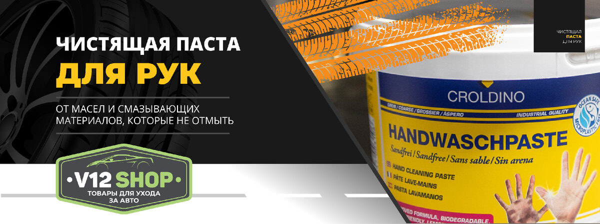 В ходе ремонта и прочих работ, проводимых в автосервисах, шиномонтажных мастерских, а также дома, на кожу рук попадают масла и различные смазочные материалы, которые трудно или невозможно отмыть с помощью мыла и воды. Для решения этой проблемы применяется чистящая паста для рук. Чистящая паста – гигиеническое средство, используемое для устранения различных загрязнений с кожных покровов рук. С ее помощью можно удалить следы смазки, жира, масла, некоторых видов краски, угля, графита, сажи, нефтепродуктов и различных смесей. На нашем сайте www.v12shop.ru представлен широкий спектр товаров для ухода за авто. На нем вы также можете найти ассортимент чистящих паст для рук. Изучим основные характеристики двух видов чистящих паст на примере товаров из каталога нашего интернет-магазина. Чистящие пасты для рук без абразивов Croldino Handwaschpaste – чистящая паста для рук производства Германии. Используется для очистки рук, испачканных грязью, акриловыми красками и прочими пачкающими веществами
