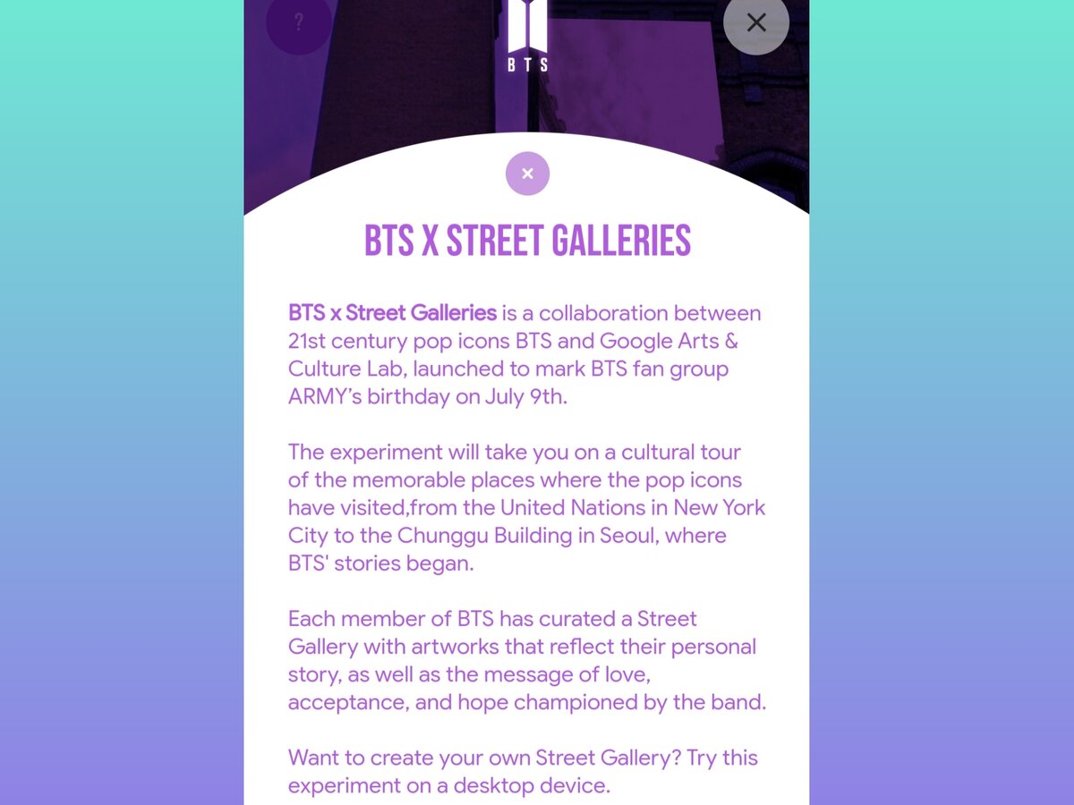 Думаю, что многие из вас в курсе того, что в интернете запущен совместный проект BTS и Google. Это, как я поняла эксперементальный проект, благодаря которому мы можем увидеть знаковые места каждого из участников. На мой взгляд, это создано для того, чтобы поклонники смогли иметь немного больше представления о каждом из ребят. Самое интересное, что о данном проекте я узнала 9 июля, в день рождение Арми. Полагаю, что все так и было расчитано. А теперь немного о самом проекте. Я решила посмотреть, что нам предложат. Я была немного удивлена. Войдя в само приложение, можно выбрать участника, который проведет экскурсию. Во всплывающих текстовых окнах, для нас представлен текст. Можно прокрутить панораму места и заметить вставки из фотографий и картин, при нажатие на которых всплывет окно, в нем коротко отражена информация. Мне показалось маловато информации. Но это только мое мнение. Не хватило там более подробного описания, все очень сжато. Я не думаю, что значимых мест у ребят настольк