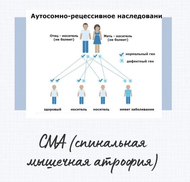 Лечение стоит 150 миллионов, а анализ 10.000 рублей… Напоминаю, я врач акушер – гинеколог, по генетике НЕ консультирую. Пост подготовлен с целью медицинской информированности населения! Но, если вы нуждаетесь в грамотном генетике – я с удовольствием готова помочь с координатами. У каждого, абсолютно у КАЖДОГО из нас есть мутации, повреждающие один из 2х одинаковых генов. Получается мы являемся здоровыми носителями. Если наша вторая половинка (супруг/супруга) имеет мутацию в этом же гене, то риск рождения больного ребёнка в такой паре будет составлять - 25%, 50% - здоровый носитель, 25% - здоровый. В социальных сетях и по ТВ мы наблюдаем постоянные сборы на лечение детям со спинальной мышечной атрофией (СМА). Это серьезное и тяжелое генетическое заболевание, вызывается изменениями в гене SMN1, имеет аутосомно-рецессивный тип наследования. Что это значит? Для болезни необходимо получить два гена с мутацией, один - от мамы, другой - от папы. Если один родитель не является нос