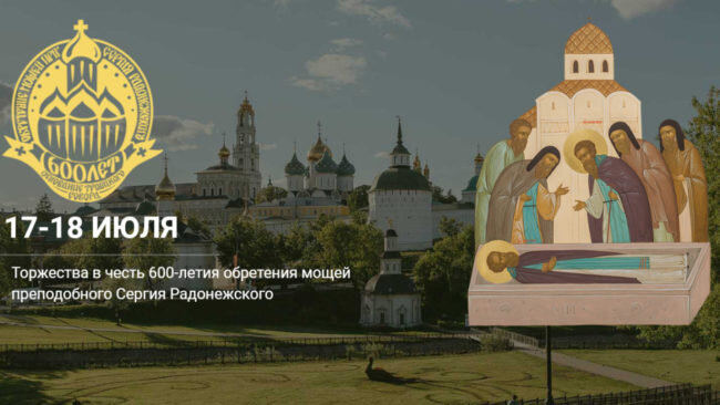 18 июля 2022 года Русская Православная Церковь празднует 600-летие обретения честных мощей преподобного Сергия Радонежского и основания Троицкого собора Свято-Троицкой Сергиевой лавры. Центральным событием юбилейного торжества станут богослужения на Соборной площади обители, которые возглавит Святейший Патриарх Московский и всея Руси Кирилл. 17 июля в 15:00 в Троицком соборе и Трапезном храме будет совершена малая вечерня с пением акафиста прп. Сергию, в 18:00 – всенощное бдение на Соборной площади. 18 июля в 05:00 – две ранние Литургии: в Троицком соборе и Трапезном храме, в 09:00 – Божественная литургия на Соборной площади. В период празднования юбилея для паломников будет организовано бесплатное размещение в палаточных городках, которые расположены в 15-20 минутах ходьбы от Троице-Сергиевой лавры, и предоставлена возможность установки одно- или двухместной индивидуальной палатки (по предварительной регистрации на сайте, где представлена актуальная информация о торжествах). Источник: