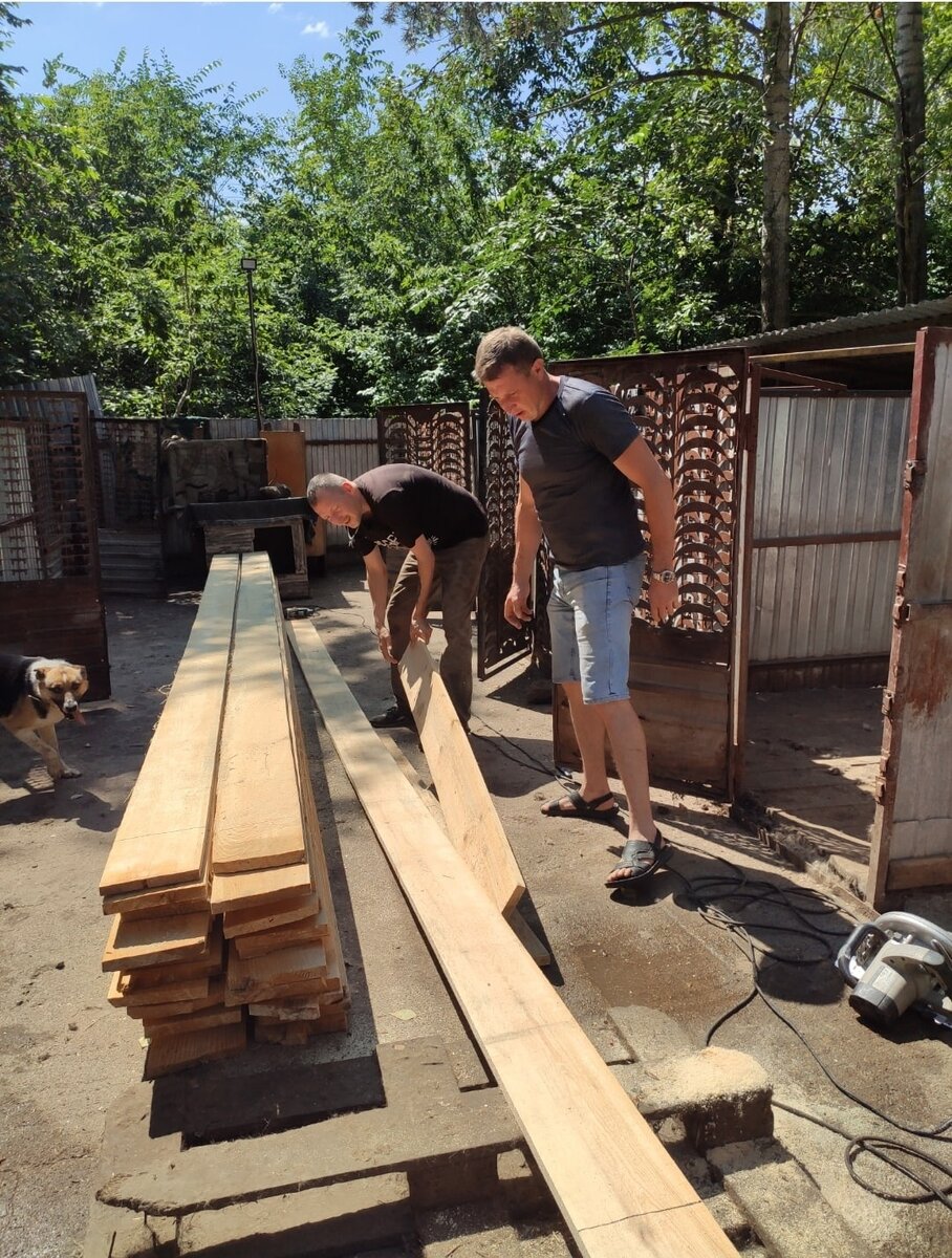 Всем Добра от Лапы Помощи! Ну что день выдался в воскресенье очень продуктивный. Главным было запланировано ремонт пола в вольерах. Доски привезли в субботу. Состояние некоторых вольеров было крайне плачевное, в таких условиях собаки жить не должны. Наша главная мужская сила в руках Ильи, в руках Вадима и Александра. Пять вольеров- полностью заменили полы, два- подремонтировали. Не все сделали, дождь хлынул . Оставляем до следующего воскресения. Мы рады, что сдвинули этот вопрос с мертвой точки. В воскресенье приезжали к нам новые гости, Артем и Кристина, очень позитивная пара. Надеемся на долгое сотрудничество с ними. Нам всегда нужны помощники, главное чтобы они любили собак и наше дело. Нам сегодня передали сухой корм и крупы. Спасибо огромное всем за помощь! Наша передержка существует только благодаря помощи неравнодушных людей. Ну и у нас было прощание с девчонками Женей и Викторией. Они учились в нашем городе на пилотов и вот в руках у них дипломы, и они уезжают к себе на роди