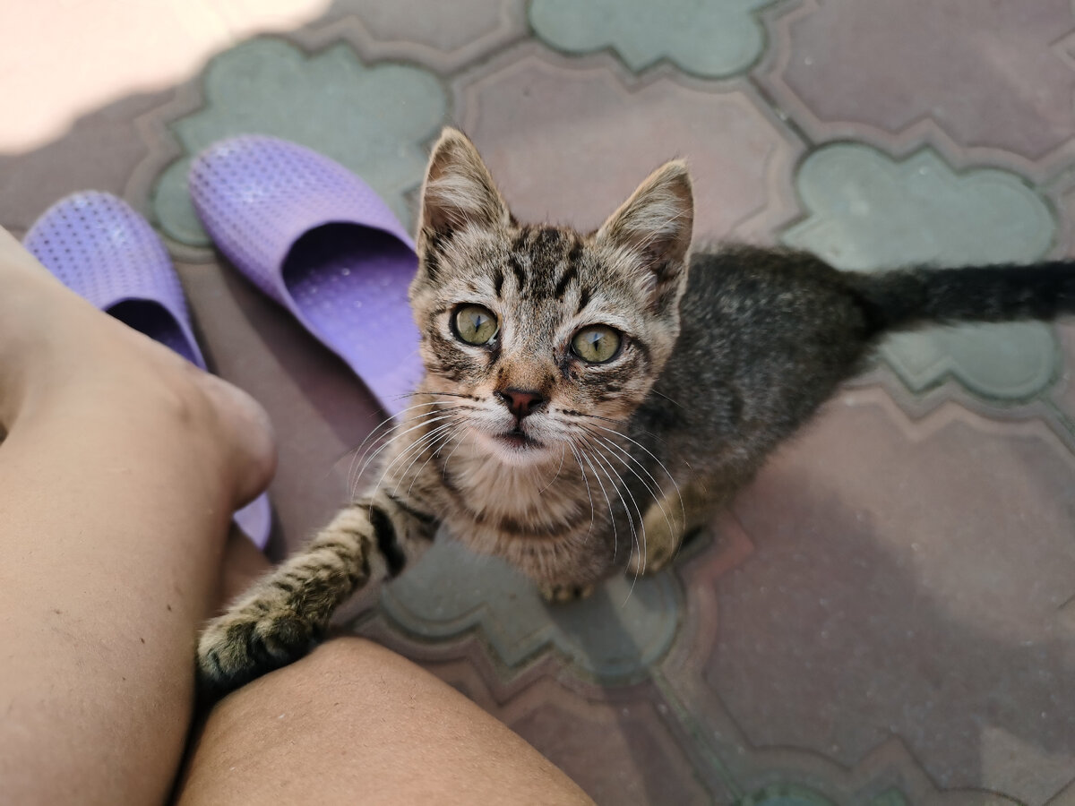 Семь дней мы провели в Дербенте, и в первый же вечер к нам пришло вот это создание. Кот, которого предварительно назвали Симба. Мы просто хотели его покормить, потом ребята поиграли с ним. Да так и остался... Пришёл он к нам грустным, ощипанным существом, у которого гноились глаза. Блохи кусали без конца. Котейке на вид 2 месяца, и можно представить, какая борьба за выживание предшествовала его появлению у нас. По повадкам видно до сих пор, что он привык клянчить еду, где-то даже воровать, наедаться впрок и не упускать шанс поживиться. Это отразилось и на его характере. Кот очень активный, напористый, сильный. По правилам естественного отбора выживает сильнейший, и Симба именно такой - он если не лев, то совершенно точно тигр :)) И в то же время ласковый и нежный зверь. Помню, первое, что нас всех удивило - это то, как громко он принялся мурлыкать, когда пригрелся на руках. Он очень громко поёт, с благодарностью. Симба диким не был с самого начала, и это удивительно! Не знаю как вы,