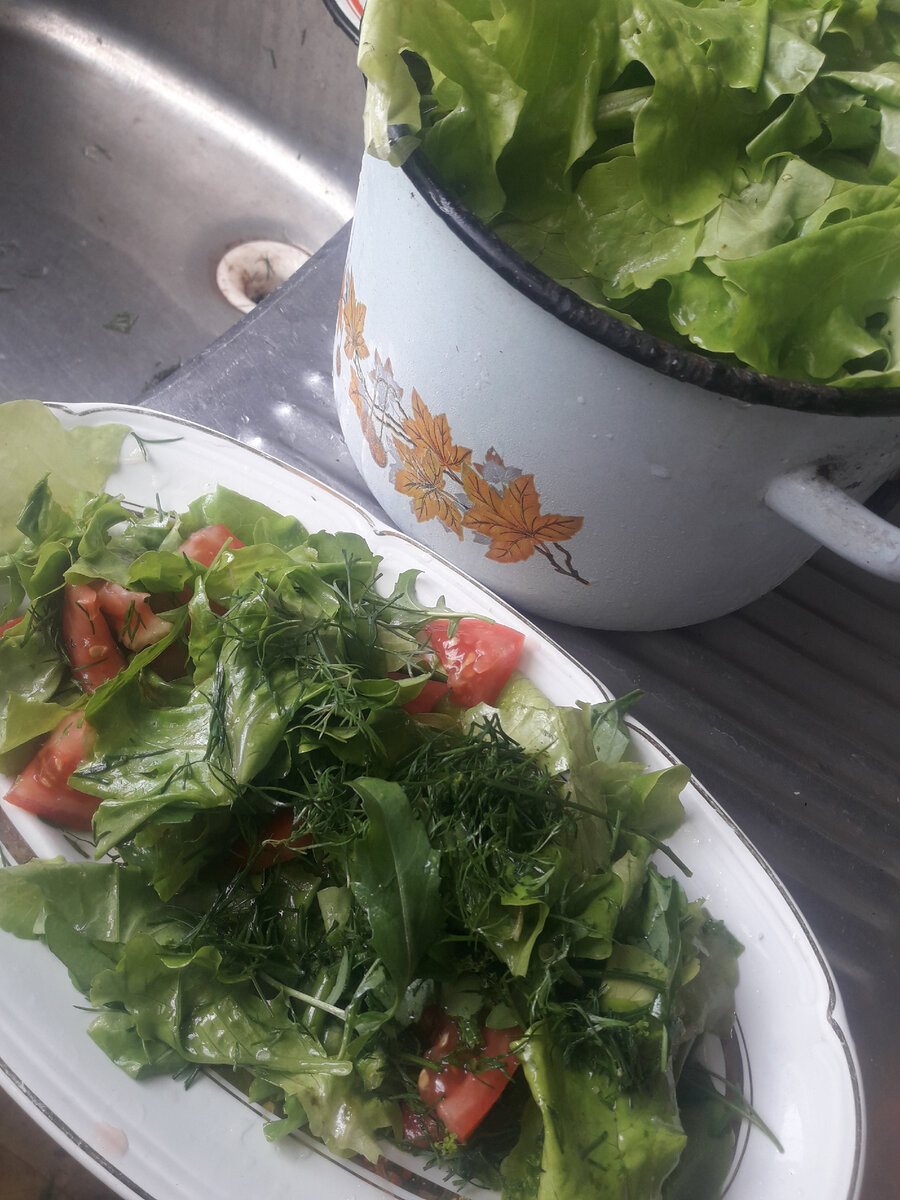 Привет, друзья! Вот и лето в разгаре и на даче полно всякой зелени выросло. А салат даже перерос уже и стал горьким. Раньше я такой салат просто в компост отправляла, но этим летом на меня нашло озарение😇. Ведь горчят лишь толстые стебли салата и его прожилки. А сама зелень листа по прежнему нежная и без горечи соответственно. Итак решила я попробовать сготовить из пересшего горького салата вкусное блюдо. Есть его можно как самостоятельное блюдо или как гарнир к любому грилю. Сначала я срываю несколько кустов переросшего салата, можно и с переросшей рукколой так поступать, и замачиваю эти кусты в ведре с водой. Воду несколько раз меняю. Затем начинаю разбирать салат на "съедобное" и "не съедобное". Отходов получается не мало. Но и "доходы", в виде большой кучки нежной салатной зелени имеются. Беру большое блюдо, выкладываю много свежей салатной листвы без прожилок и черенков. Жаль нет лимона. Мне бы не помешала ложка лимонного сока. Но мы на даче , потому используем что есть. Тру