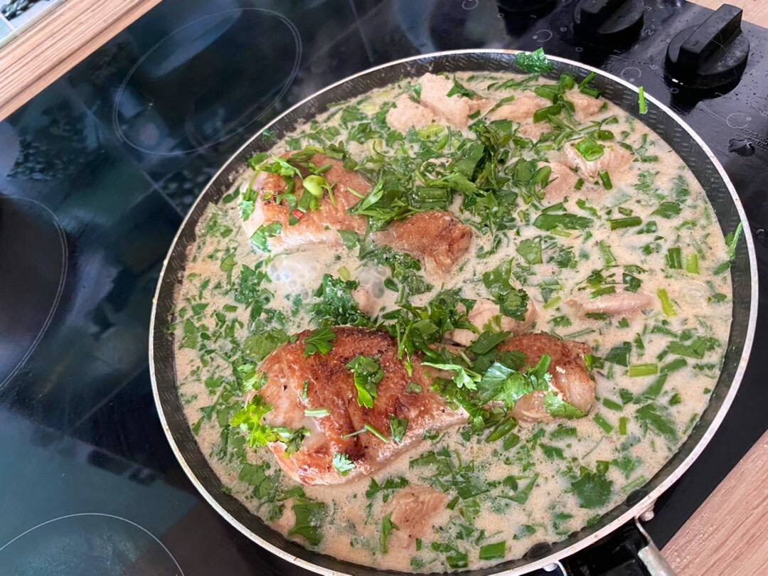 Легкий , быстрый и просто в приготовлении рецепт, и главное очень вкусный ) Ингредиенты: Курица (у меня было две ножки и грудка), Сливки 10%, Вода, Специи (у меня смесь перцев, аджиномото, соевый соус), Соль, Зелень, Сыр Способ приготовления: В курицу добавляем сметану 1-2 столовые ложки, соевый соус так же, немного соли. Так как у меня две большие ножки и филе, первыми на сковороду я отправляю ножки и жду когда они обретут корочку с двух сторон. Зелень нарезаем, сыр натираем. Когда ножки подрумянились, кладу туда оставшееся филе поджариваю и ставлю на медленный огонь. Когда курица полностью готова, заливаю все сливками и водой в соотношении 70% сливок 30% воды. Добавляем специи перемешиваем и оставляем на медленном огне на 5 минут, не больше, иначе сливки свернутся. Снимаем с огня, добавляем зелень и сыр, оставляем настояться под крышкой:) Подавать можно как с любым гарниром так и просто как основное, сама я гарниры не ем, а своему мужу подаю со спагетти или рисом). Приятного аппетита